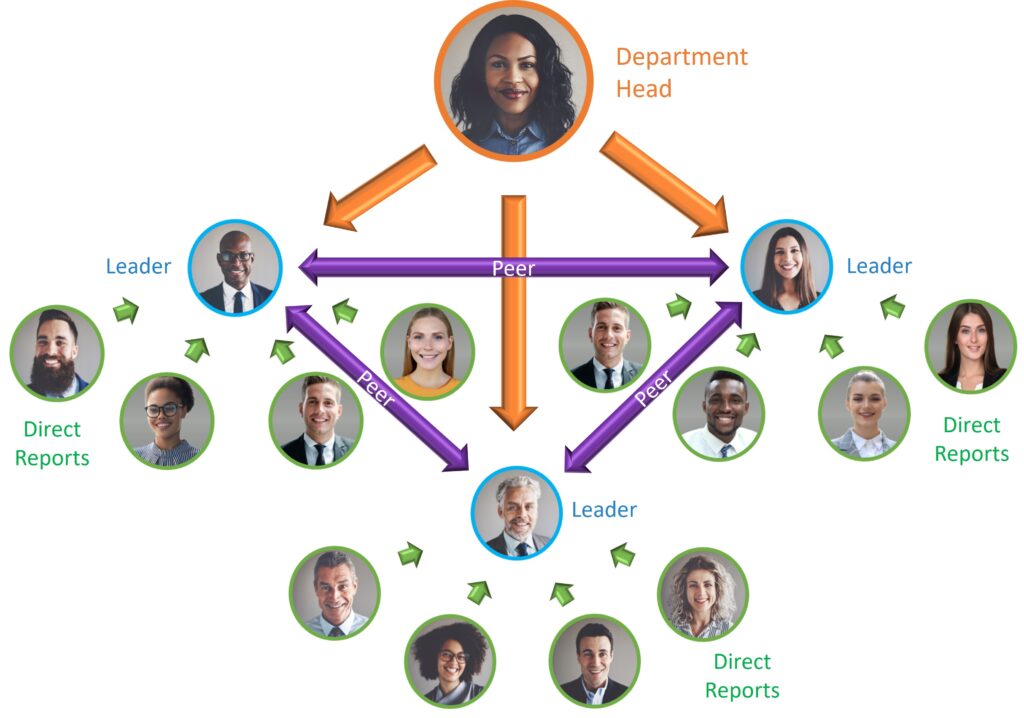 In a LeadershipRMTM 360, the leader completes an individual self-assessment, and their team (immediate supervisor, their peers and their direct reports) completes an assessment of the leader. The questions are the same with a slight variation in how they are stated.
