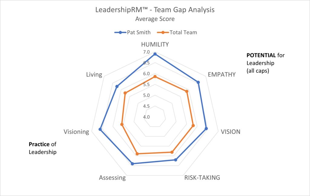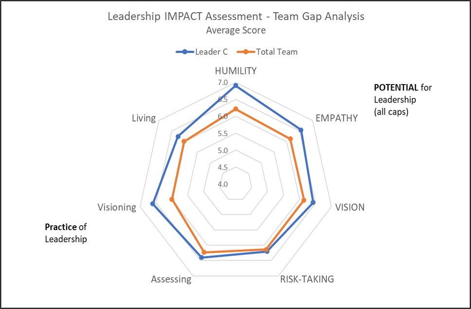 A potentially toxic situation is typically illuminated when the leader and the team assessments are significantly out of sync. Toxic leaders usually have an exaggerated perception of their leadership abilities. As the radar chart indicates, the leader’s perception is much greater than that of their team’s perception. This is a situation that requires immediate action by the organization.