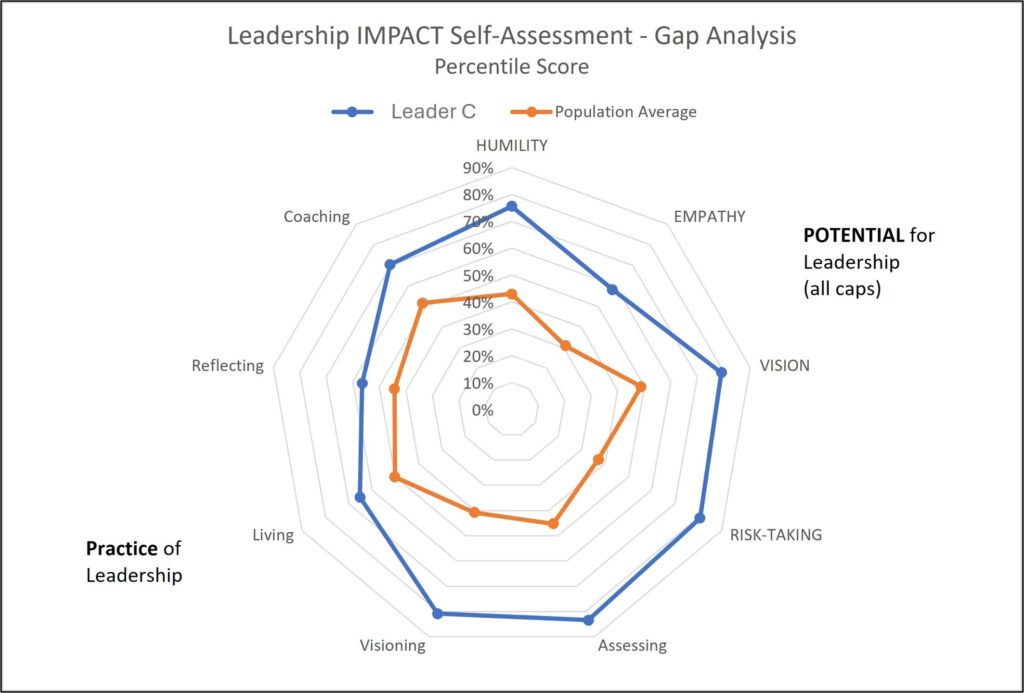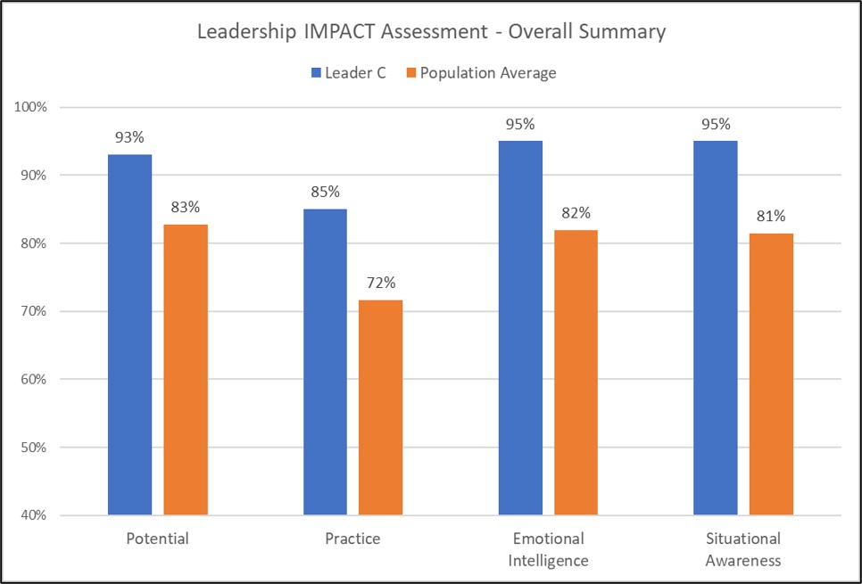 LeadershipRMTM was utilized to assess the team to enable the CNO to make more informed decision-making in promotions, assignments, retention and hiring. Each leader completed the Leadership IMPACT Assessment, a proprietary tool created by the Elite Leadership Academy. It combines research methods, with an understanding of human behavior, which is summarized using leading data analytics and visualization practices, as well refinement using AI. It measures 9 dimensions of leadership behavior using a 7-point Likert scale, summarized into the Potential for Leadership (innate qualities) and Practice of Leadership (leadership behaviors).