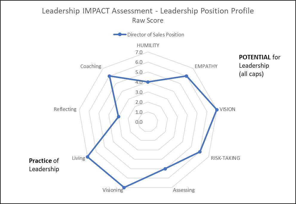 The role calls for substantial risk-taking in owning aggressive financial objectives, competitive market penetration, and visible external representation at trade shows and with major accounts. Empathy and interpersonal skill are important for managing internal and external relationships, though humility and structured reflection are less explicit, suggesting a culture oriented more toward urgency, performance, and initiative than deliberate introspection. Overall, the position aligns best with high leadership potential in vision and risk-taking, and strong practice in visioning, living, and coaching, making it well suited to a decisive, strategic, people-developing sales leader who can learn to embed more explicit reflective habits over time.
