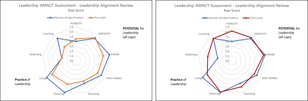 - Determine how well the incumbent leader aligns with the current or revised position description. This is accomplished by comparing the leader’s assessment results to the position description’s ratings. The leader on the left (Pat Smith), is misaligned to the position’s leadership requirements, versus the leader on the right (Chris Jones), who is more aligned with the position’s leadership requirements. The organization should determine if the leader’s alignment can be improved through coaching of if they would be better aligned elsewhere in the organization.